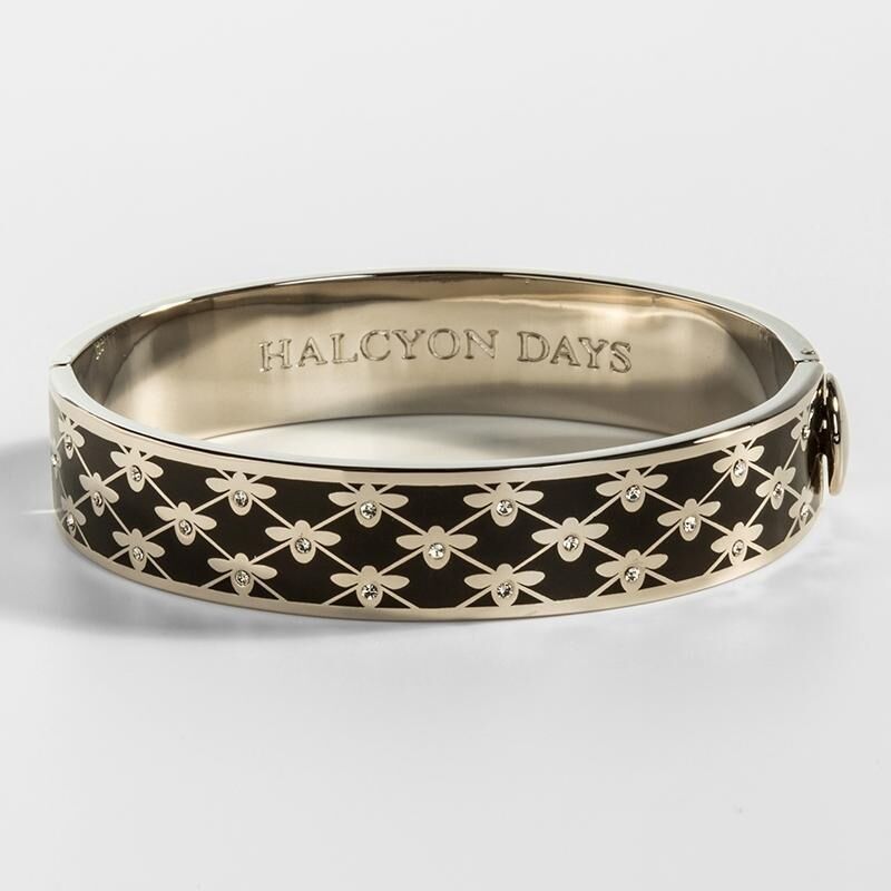 Son derece yetenekli zanaatkarlar tarafından hazırlanmış bu 13 mm emaye menteşeli siyah ve paladyum bileklik, basit bal arısı silüetleri ile kafes desenlerine sahiptir. Zarif ama göz alıcı bir görünüm için her bir arıya hassas cam kristal detayı eklenmiştir.