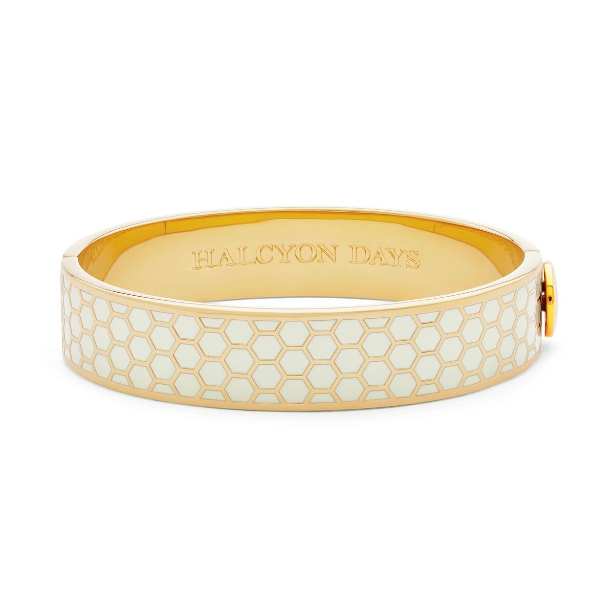 Tanım Honeycomb Cream & Gold Menteşeli Bilezik, modern stilin ve zamansız zarafetin mükemmel bir karışımıdır. Bu çarpıcı parça, krem emaye bir taban üzerine yerleştirilmiş, titizlikle hazırlanmış altın petek desenine sahiptir. Menteşeli tasarım, kolay kullanım ve rahat bir uyum sağlayarak onu her durum için ideal bir aksesuar haline getirir. Tek başına veya üst üste takıldığında, bu bilezik her kıyafete sofistike bir dokunuş katar. Gerçek bir ifade parçası, koleksiyonumuzu tanımlayan sanatçılığı ve işçiliği temsil eder.
