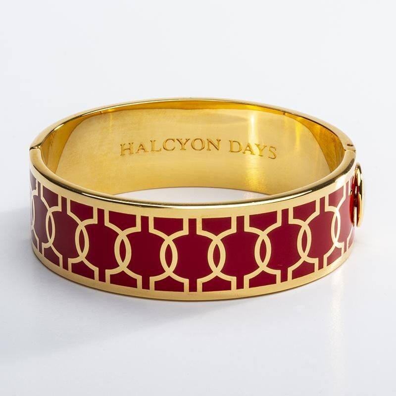 19 mm genişliğindeki geometrik kırmızı ve altın menteşeli bilekliğimiz en çarpıcı tasarımlarımızdan biridir ve her kıyafete ışıltı katar. 18 ayar altın plakada tamamlandı.