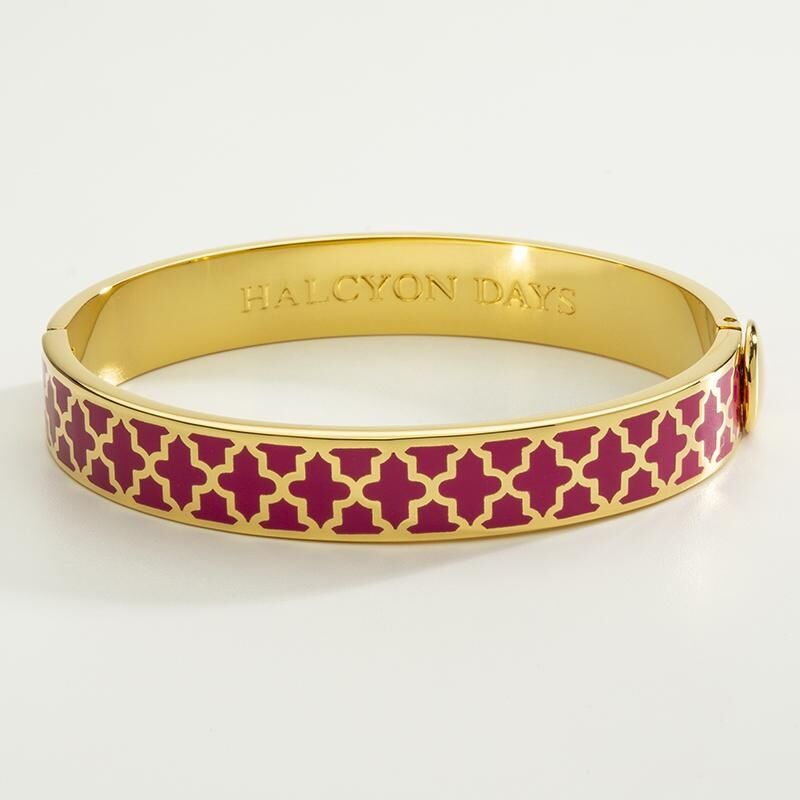 Agama bileklik 10 mm genişliğinde ve gösterişli bir görünüm için 18 ayar altın kaplamadır. Menteşeli toka ve iç kısmında Halcyon Days logosu bulunan bu zamansız tasarım, diğer bileziklerle birlikte veya tek başına takıldığında harika görünüyor.