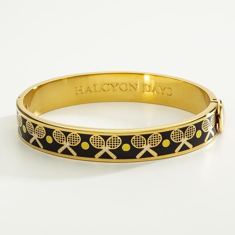 Tenis Raketimiz ve Top bileziğimiz 10 mm genişliğinde ve gösterişli bir görünüm için 18 ayar altın kaplamadır. Menteşeli toka ve iç kısmında Halcyon Days logosu bulunan bu eğlenceli tasarım, hediye bölümünde asları servis ederken görecek.