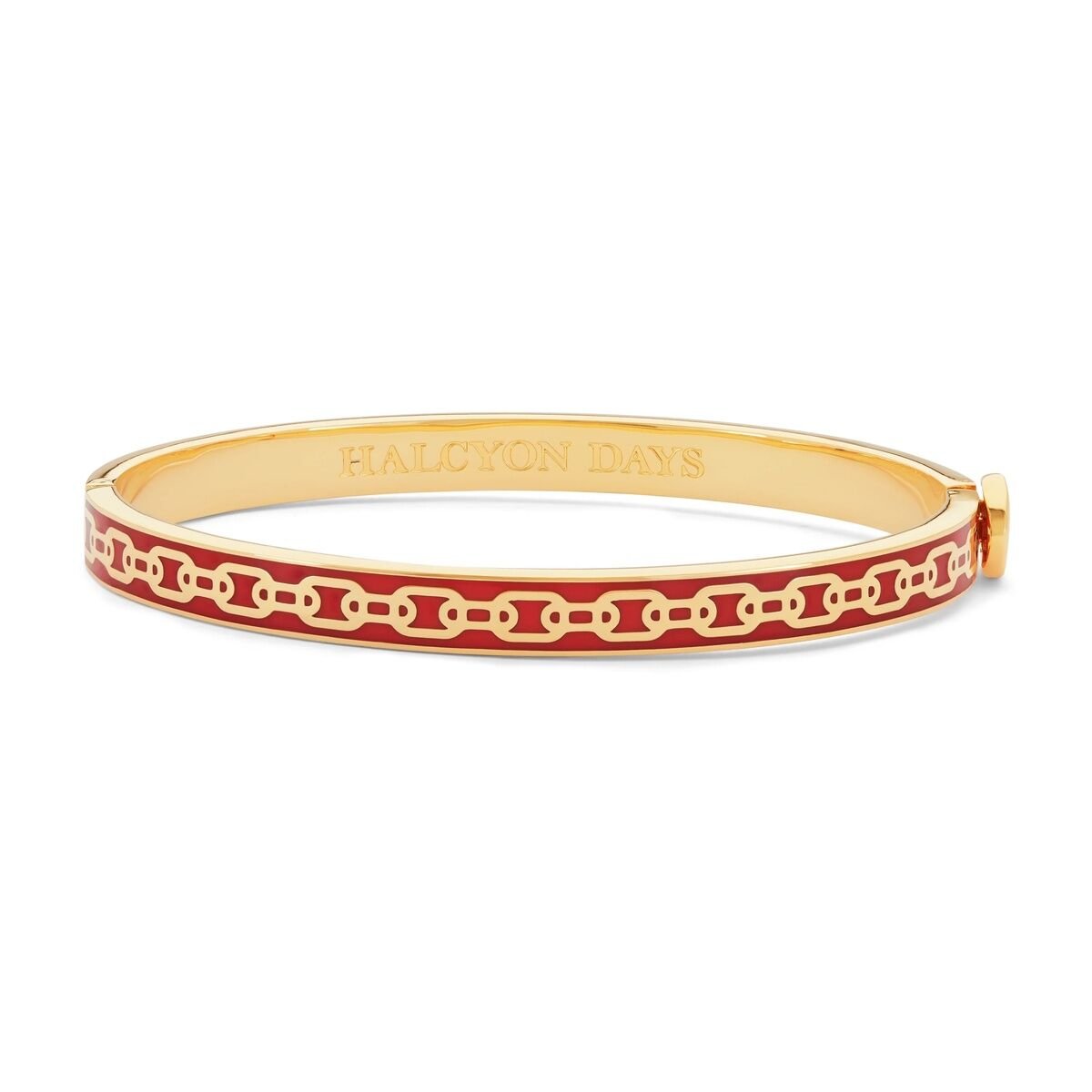 Tanım Pirinçten üretilen ve 18 ayar altınla kaplanan bu 6 mm ince bilezik, kırmızı emaye tabanlı çağdaş zincir tasarımına sahiptir. Bileğe kolayca geçirilebilen, şık bir şekilde üst üste takılabilen veya tek başına giyilebilen, gündüzden geceye aksesuar olarak mükemmel bir parça. Ölçümler Genişlik 52mm Yükseklik 60mm Çevre 176mm