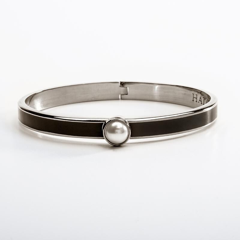 Bu 6 mm bileklik, 18 ayar paladyum kaplamaya , siyah emaye tabana ve menteşeli toka üzerinde kabartmalı bir kabaşon inciye sahiptir.