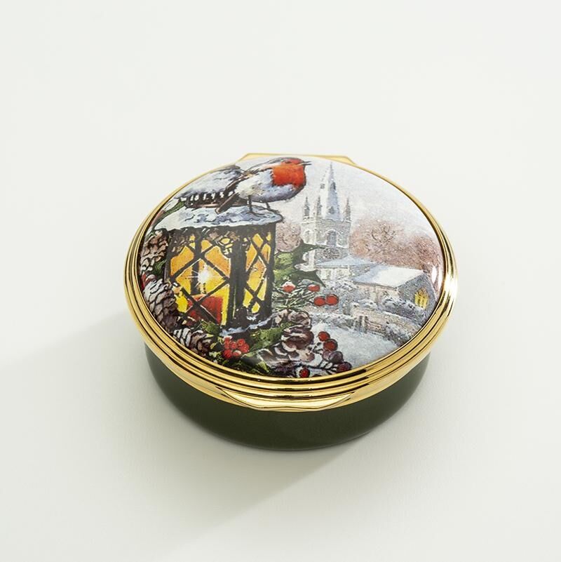Bu büyüleyici, el yapımı emaye kutu, şenlik duygusuyla dolup taşıyor. Tuhaf, karlı bir sahnede, parlak bir şekilde yanan bir fenerin üzerine tünemiş bir kızılgerdan görüyoruz. Kapağı kaldırmak, romancı Taylor Caldwell'den bu yıl özellikle anlamlı bir mesaj gibi gelen bir alıntıyı ortaya çıkarıyor.