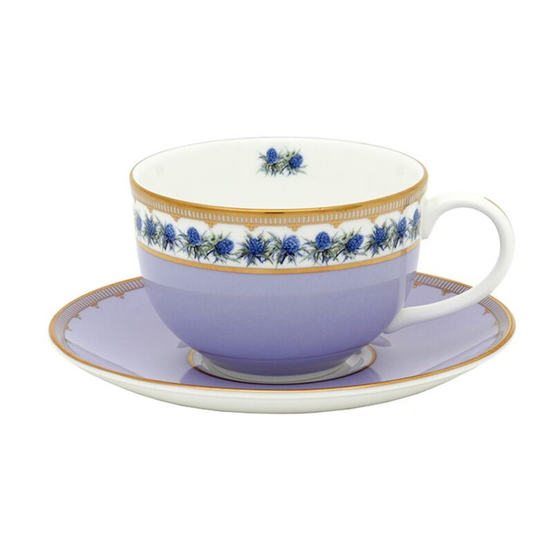 Bu el yapımı ince porselen çay fincanı ve tabağı, görsel olarak yatıştırıcı bir leylak arka plan üzerinde, İskoçya'nın ulusal çiçeği olan gelişen devedikeni içerir.