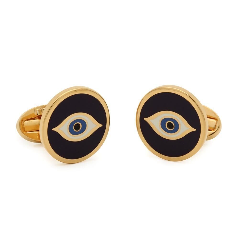 Yetenekli zanaatkarlardan oluşan ekibimiz tarafından elle işlenmiş bu çarpıcı kol düğmeleri 18 kt altınla kaplanmıştır ve gece mavisi bir arka plana karşı şık nazarlık tasarımımıza sahiptir.
