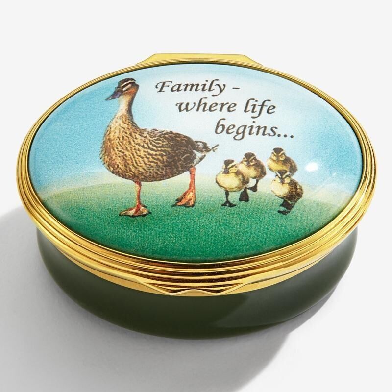 Başka hiçbir şeye benzemeyen bir kutu olan bu seçkin el işi parça, aileyi kutlamak için mükemmel bir hediye. Tatlı ördek illüstrasyonuyla süslenmiş bu emaye kutuda, 'Hayatın başladığı ve aşkın asla bitmediği aile' sözleri yer alıyor. Sevilen birine hediye etmek için gerçekten unutulmaz bir parça.