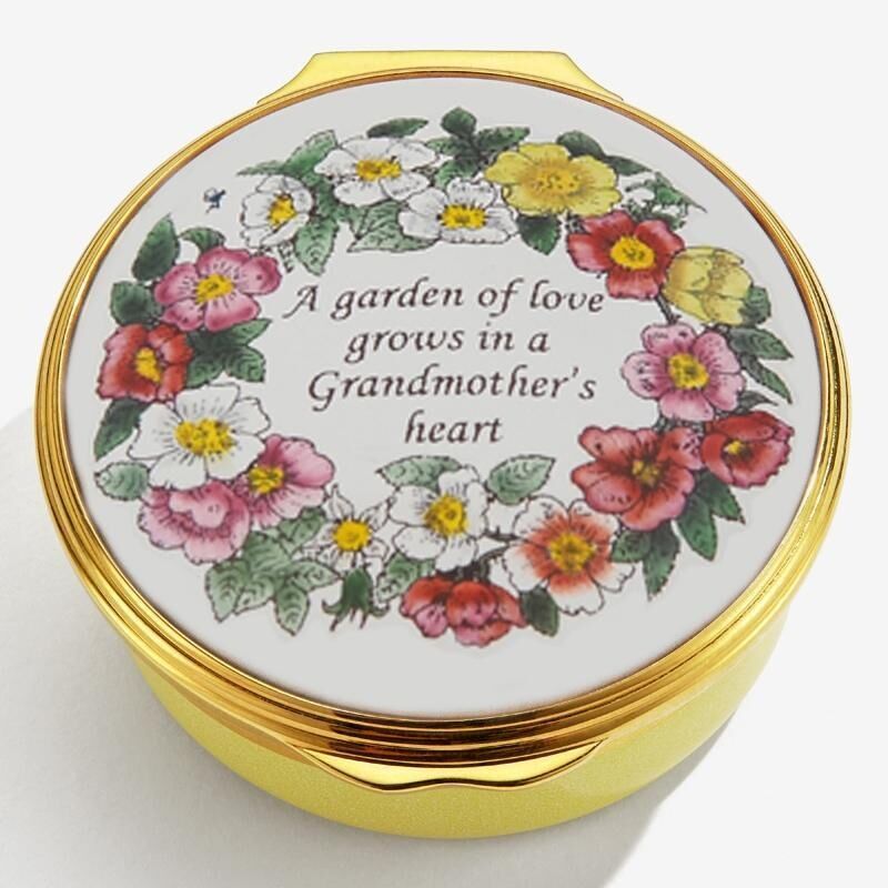 Bu neşeli emaye kutu, 'Büyükannenin kalbinde bir aşk bahçesi büyür' mesajını çevreleyen canlı bir çiçek aranjmanı ile süslenmiştir.