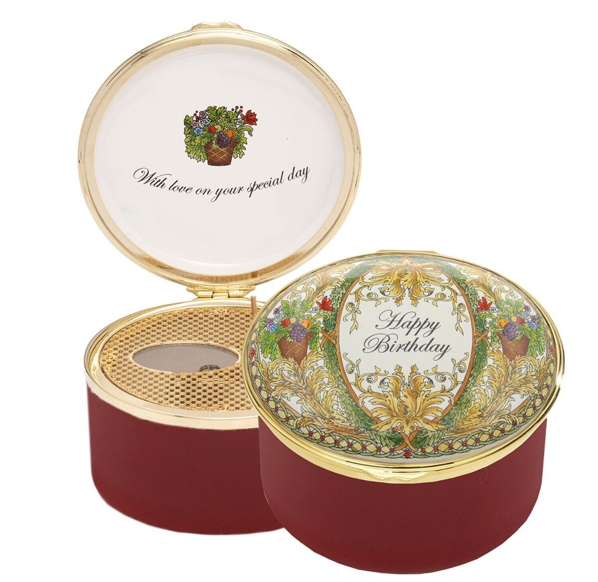 Bu güzel el yapımı emaye kutu açıldığında Mutlu Yıllar şarkısının tamamını çalar. Halcyon Days, günümüzün uzmanları için 18. yüzyılın bakır üzerine emaye sanatını yeniden canlandırıyor. Bu zarif kutu, İngiltere'de titizlikle el yapımıdır ve orijinal zanaatkarlar tarafından kullanılan tekniklerin aynısı olan 24 ayar altın kaplama bağlantı parçalarıyla elle minelenmiştir.