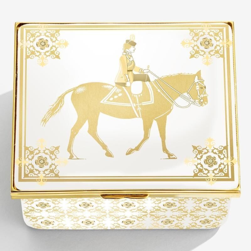 Bu özenle elle boyanmış altın emaye müzik kutusu 25 adet ile sınırlıdır ve Majesteleri Kraliçe'yi Buckingham Sarayı arazisinde en değerli atı Burma'da güzel bir şekilde göstermektedir.