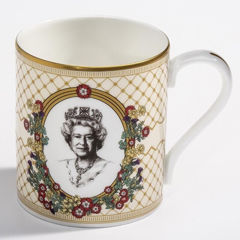 Majesteleri Kraliçe'nin portresi, Diyarın Çiçekleri ile süslenmiş, fildişi arka planla güzel bir şekilde eşleştirilmiş ve altın bir kafes ile tamamlanan bir kartuşla çerçevelenmiştir. Yetenekli zanaatkarlarımız tarafından Stoke-on-Trent'te yapılan bu kupa, İngiliz ince kemik çinisinden yapılmıştır.