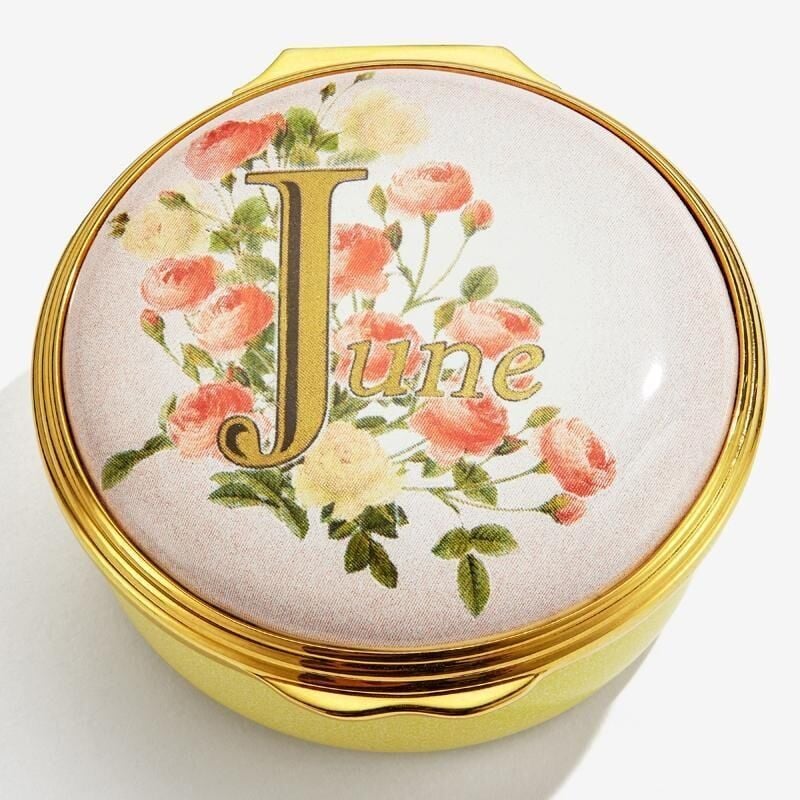 Güzel pembe ve krem şakayıklar, üzerinde 'Haziran' yazan ve 18 ayar altınla özenle boyanmış bu el yapımı emaye biblo kutuyu süslüyor.