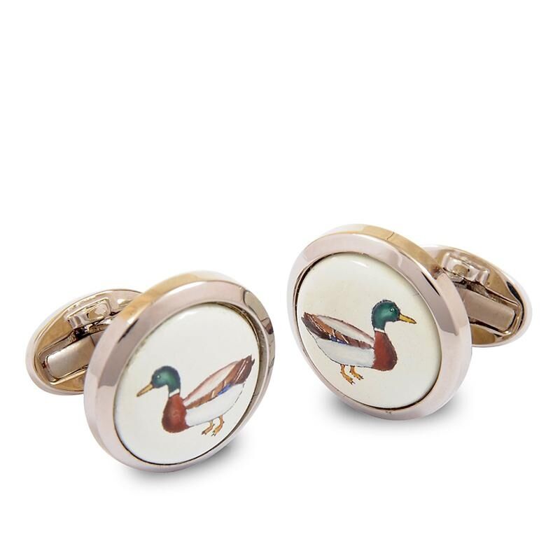 Bu keyifli kol düğmeleri kesinlikle sizi etkileyecek. Fildişi bir arka planda paladyum montajlı iki yeşilbaş ördek, eğlenceli ve şakacı bir İngiliz tasarımı