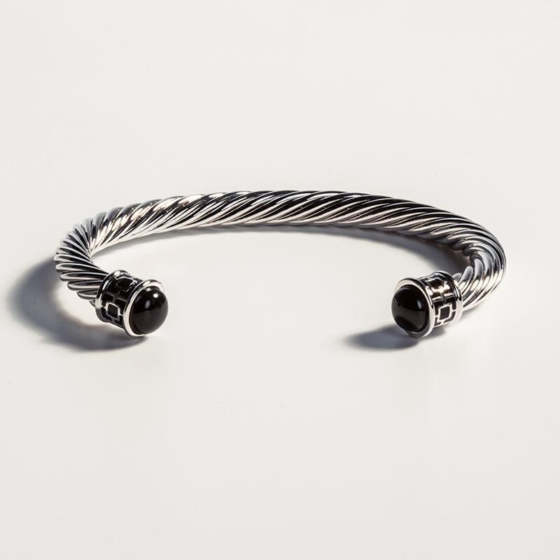 Bu bileklik pirinçten yapılmıştır ve her bir ucu siyah emaye kaplama ile süslenmiş kavisli serbest biçimli bir siluete bükülmüştür. Koleksiyondan benzer stiller ile tek başına veya üst üste giyin. Mükemmel uyum için hafifçe sıkın.