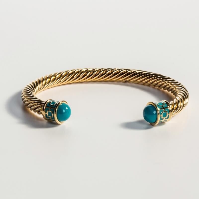 Bu bileklik pirinçten yapılmıştır, 18 ayar altınla kaplanmıştır ve bükülerek kavisli serbest biçimli bir siluet elde edilmiştir ve her bir ucu turkuaz emaye kaplama ile süslenmiştir. Koleksiyondan benzer stiller ile tek başına veya üst üste giyin. Mükemmel uyum için hafifçe sıkın.