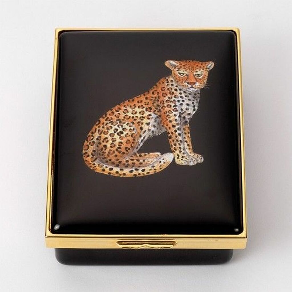 Çarpıcı leopar siyahı emaye kutu, Magnificent Wildlife koleksiyonumuzun bir parçasıdır. El boyaması leoparımız siyah emaye arka planda gururla duruyor.