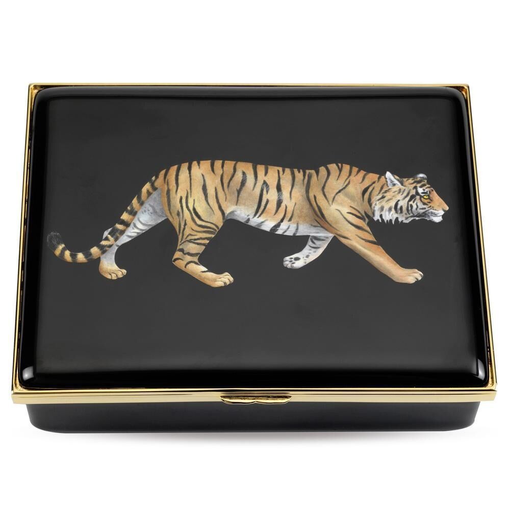 "Tyger, Tyger parlak yanıyor" - William Blake'in ünlü şiirinden esinlenerek, üzerinde bir kaplanın takip ettiği bu elle boyanmış emaye kutu, Muhteşem Yaban Hayatı koleksiyonumuzun en önemli parçasını oluşturuyor.