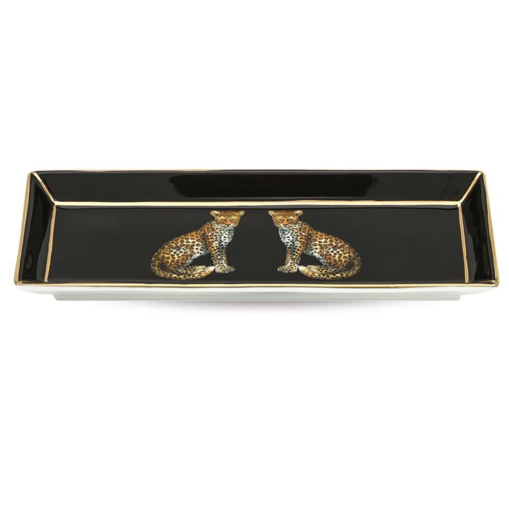 Siyah dikdörtgen tepsi üzerindeki çarpıcı ikiz leopar, Magnificent Wildlife koleksiyonumuzun bir parçasıdır. Elle boyanmış leoparlarımız, siyah ince kemik çini arka plan üzerinde güçlü bir şekilde poz veriyor.