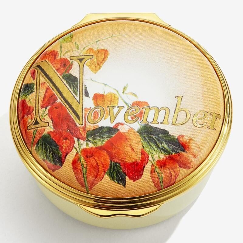 Kasım her zaman hatırlanması gereken bir aydır! Halcyon Günleri'nden 'Kasım' kutusuyla unutulmaz bir anınızı kutlayın. Bir demet yanmış turuncu physalis' ve yumuşak sarı bir tabana sahip bu emaye biblo kutusu, İngiltere'de baştan sona elle üretildi.