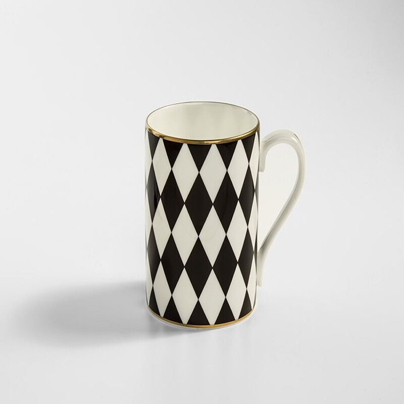 Bu İngiliz ince porselen kupa, siyah beyaz dama tahtası Parterre tasarımımıza sahiptir. Sofistike sipperlar için zarif bir parça, gösterişli ve lüks bir görünüm için elle yaldızlanmıştır.