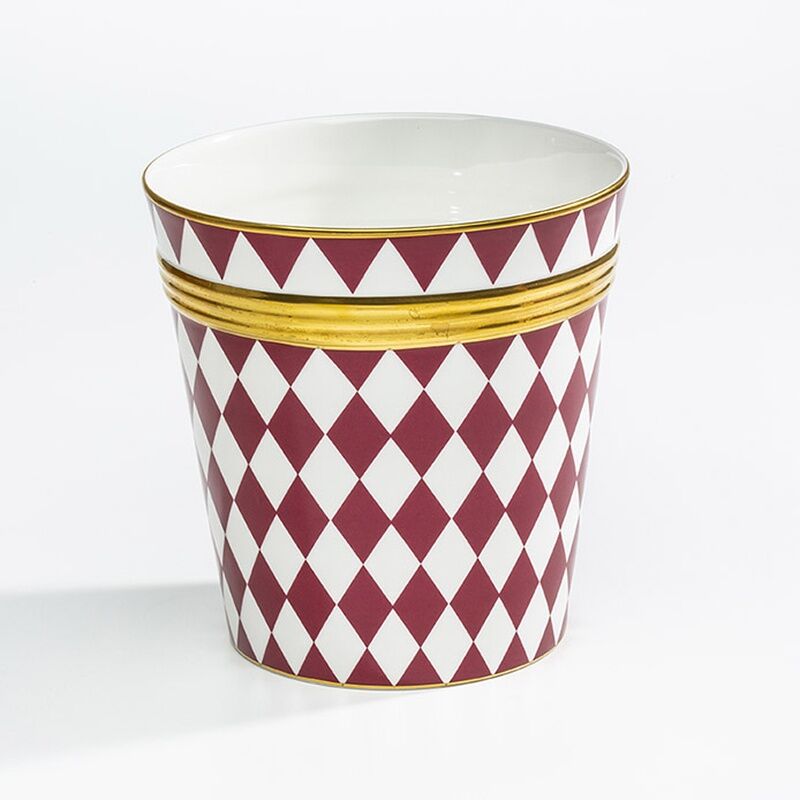 Fransız Rönesansı bahçelerinin simetrik ve geometrik dikiminden ilham alan elmas tasarımlı kırmızı Parterre Cachepot'u keşfedin. İngiliz ince kemik çinisinden yapılmış bu parça, herhangi bir tuvalet masası, komodin veya sehpa için mükemmel ve lüks bir ektir.