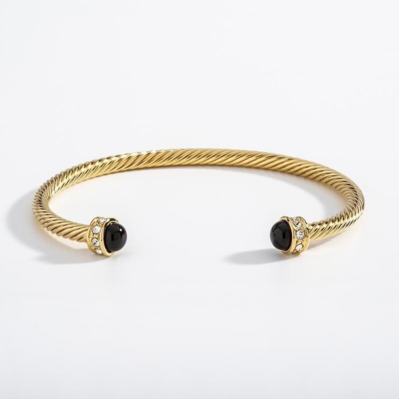 Bu bileklik pirinçten yapılmıştır, 18 ayar altınla kaplanmıştır ve bükülerek kavisli serbest biçimli bir siluet elde edilmiştir ve her bir ucu siyah emaye kaplama ile süslenmiştir. Koleksiyondan benzer stiller ile tek başına veya üst üste giyin. Mükemmel uyum için hafifçe sıkın.