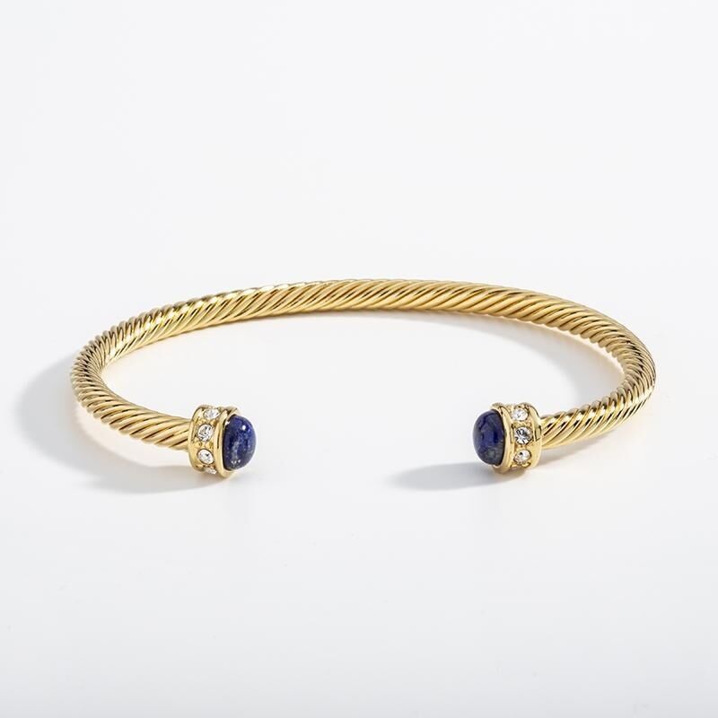 Bu bileklik pirinçten yapılmıştır, 18 ayar altınla kaplanmıştır ve her bir ucu derin kobalt emaye kaplama ile süslenmiş kavisli serbest biçimli bir siluet oluşturacak şekilde bükülmüştür. Koleksiyondan benzer stiller ile tek başına veya üst üste giyin. Mükemmel uyum için hafifçe sıkın.