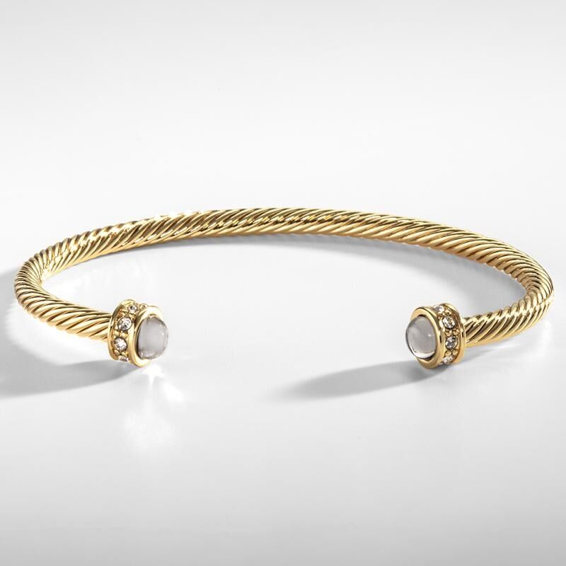 Bu bileklik pirinçten yapılmıştır, 18 ayar altınla kaplanmıştır ve her bir ucu cam kabaşonlarla süslenmiş kavisli serbest biçimli bir siluet halinde bükülmüştür . Koleksiyondan benzer stiller ile tek başına veya üst üste giyin. Mükemmel uyum için hafifçe sıkın.
