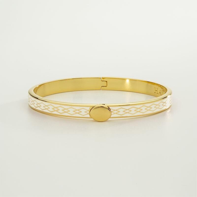 Krem, siyah, kırmızı, turuncu, derin kobalt ve turkuaz dahil olmak üzere yedi emaye renginde mevcut olan her Parterre 6mm Menteşeli Bileklik her durum için uygundur. Bu bileklik üzerinde Parter'in tekrar eden geometrik tasarımı onu modern bir klasik haline getiriyor.