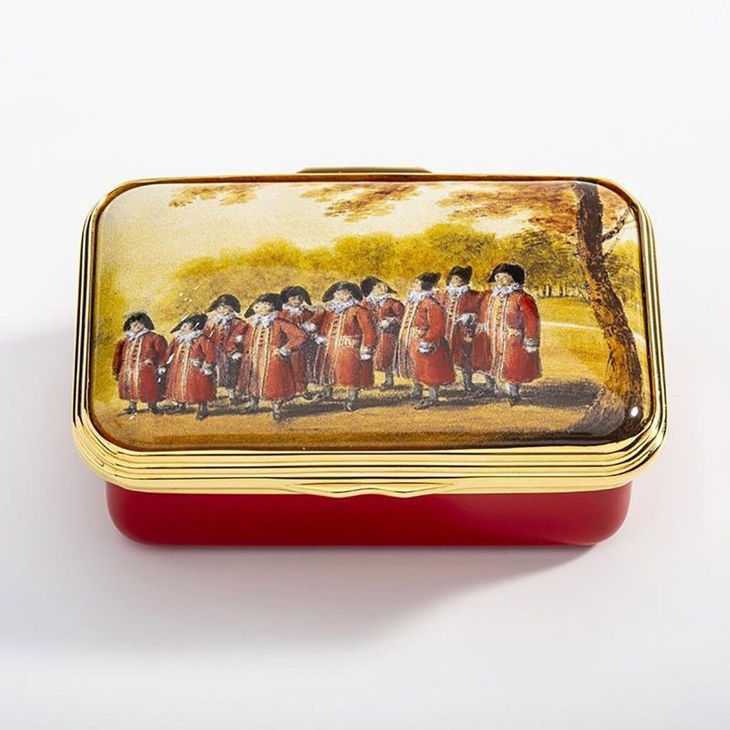 Halcyon Günleri Emaye Kutusu, Westminster'daki St James's Park'tan geçen Kraliyet Şapeli Çocuklarının yer aldığı, bilinmeyen bir sanatçı tarafından yapılmış 1790 dolayları suluboya. Kraliyet Şapeli, Hükümdar'a hizmet etmek üzere atanan Rahiplerin, koro üyelerinin ve Vestrymen'in eski vakfıdır. "Chapel Royal'in Çocukları" olarak bilinen koro üyeleri, Westminster'daki St James's Park'ta bir sonbahar sahnesinde, Kral II. Charles'ın 1661 tarihli emri uyarınca Şapel üniformasını giyerek bir araya geliyor. Boyut U 6,5 cm x G 4,5 cm