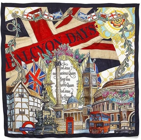 Bu zarif ipek eşarp, ünlü İngiliz ikonlarını birleştiren 'Glorious saltanat' tasarımımıza sahiptir.