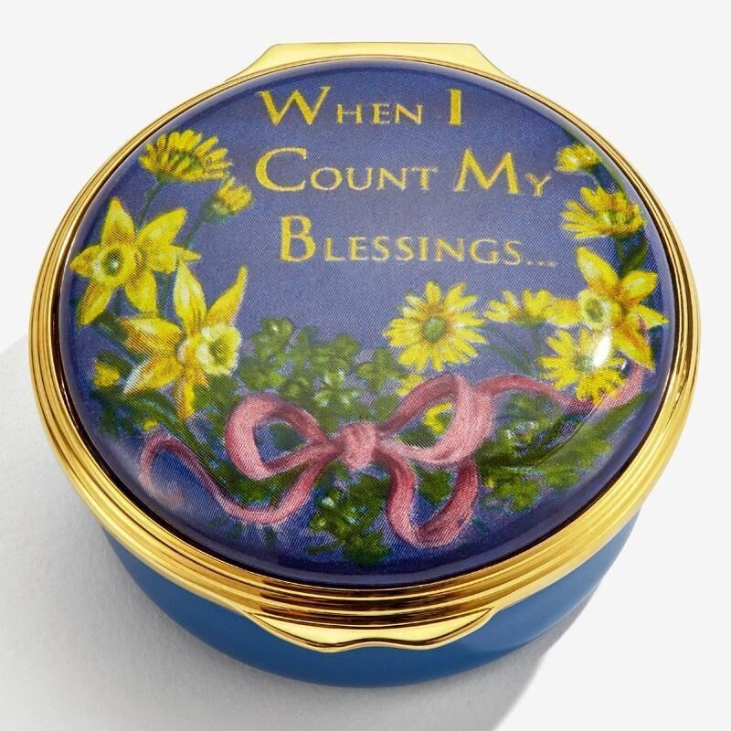 Çiçek detaylı bu güzel kraliyet mavisi kutu, tüm emaye kutularımız gibi, İngiltere'nin kalbindeki stüdyolarımızda el boyaması ve el yapımı olarak yapılmıştır. Bu özel kişi için duyduğumuz minnettarlığı özetleyen bu harika hediye, 'Nimetlerimi saydığımda seni iki kez sayıyorum' sevimli bir alıntıya sahiptir.